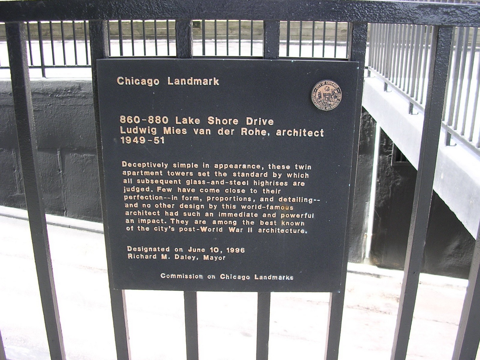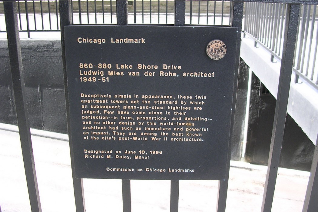 Ludwig Mies van der Rohe designed the pair of twenty-six-story residential buildings. Constructed from 1949 to 1951, the buildings were listed in the National Register of Historical Places in 1980 and designated a Chicago landmark in 1996. The building and garage structure consist of a concrete-encased steel frame and reinforced concrete floor slabs. Glass lobbies from both buildings are set back from the perimeter columns.