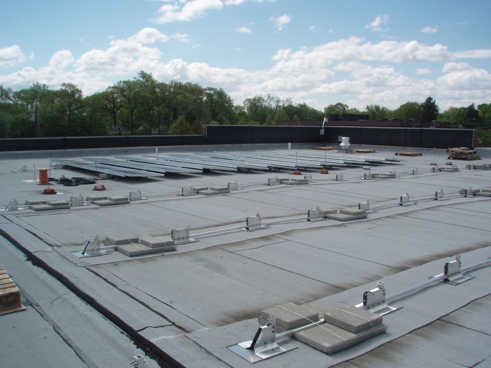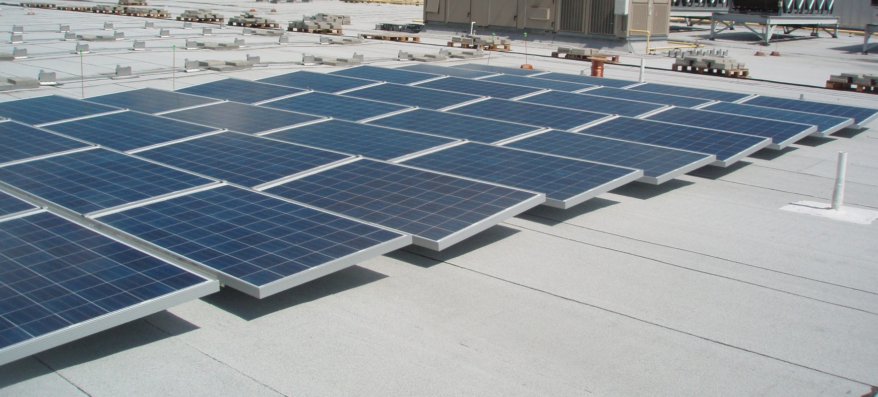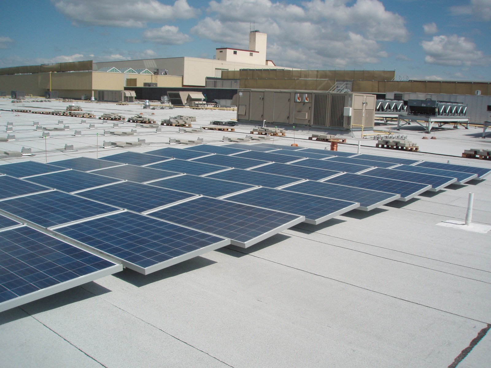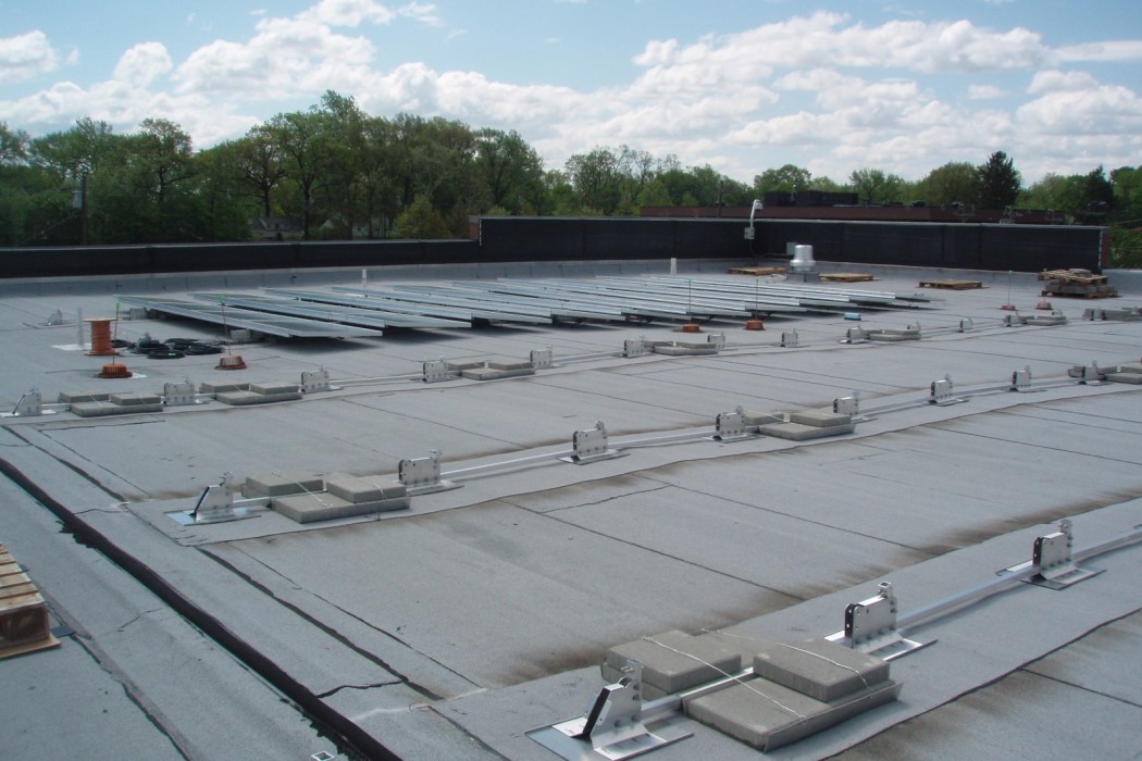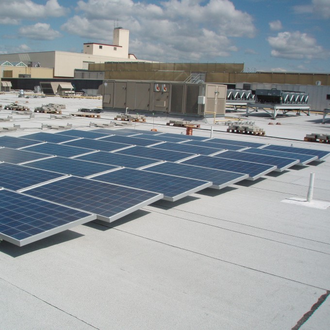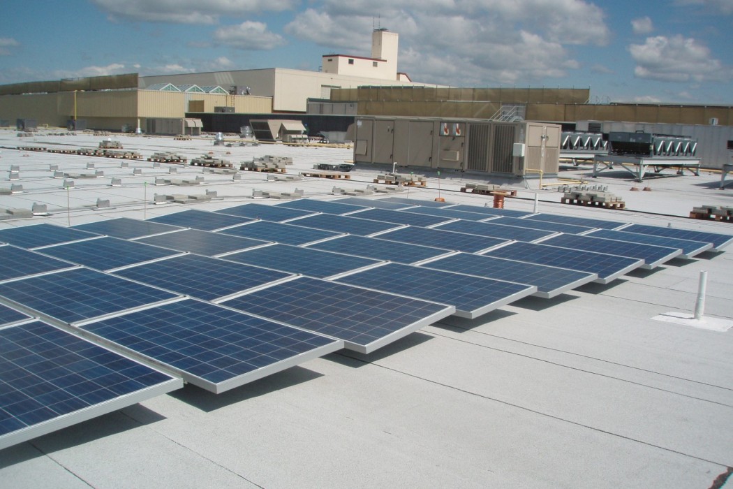 WJE evaluated the existing roofs and reviewed the integration of the solar panel arrays into the two existing roof systems at the mall. Arrays were hinged to allow for access to the underside of the array, and underlying roofing was installed on protection membrane sheets of the appropriate roofing.