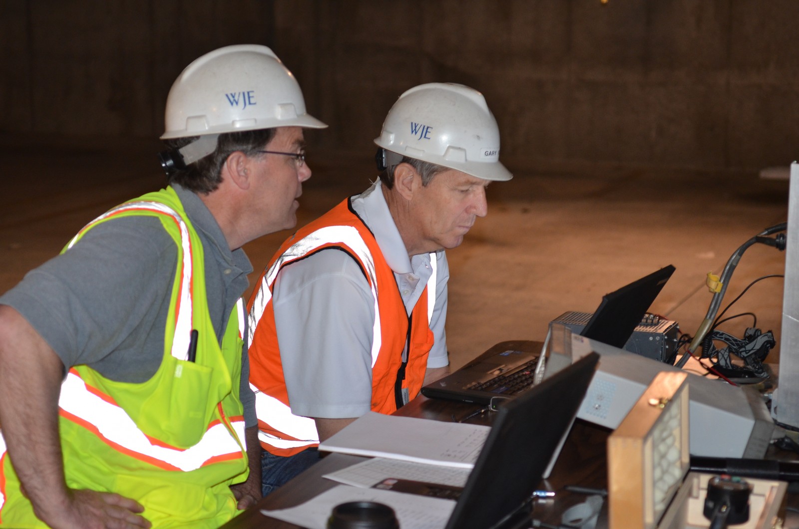 Over a two-year period, WJE completed an exhaustive investigation of the structures' history, current condition, and cause of reported distress. A plan for computer modeling and field testing was developed to better understand the behavior of the three structures. Testing included condition surveys, plumbness and levelness surveys, concrete coring and core compression testing, verification of tendon drape, and pull-testing of representative tendons. The testing culminated in the load testing of each structure.