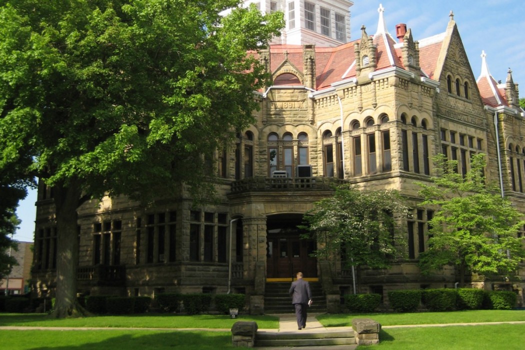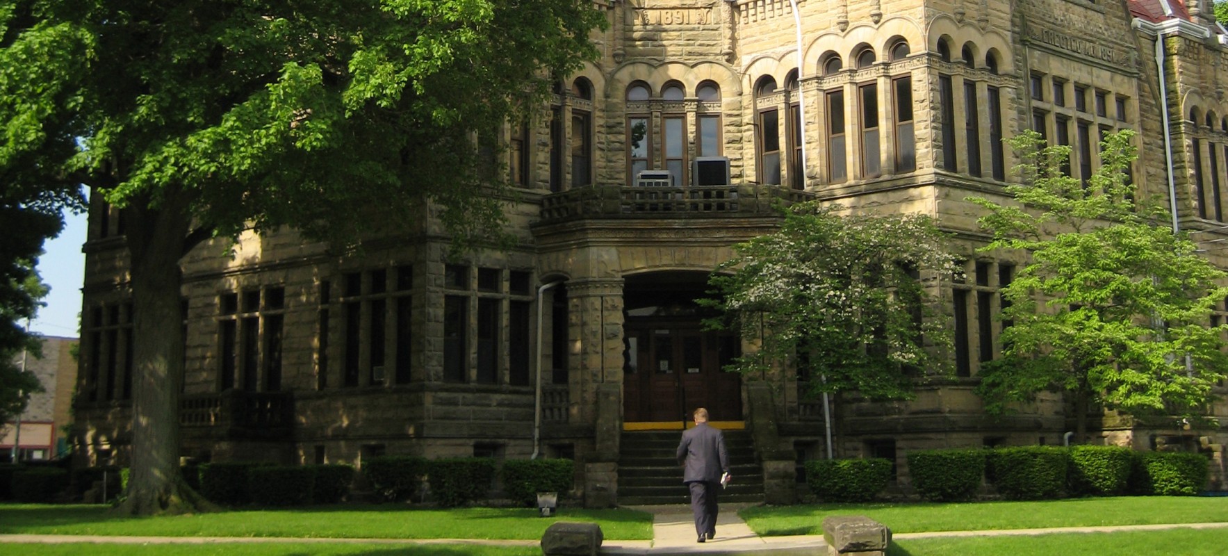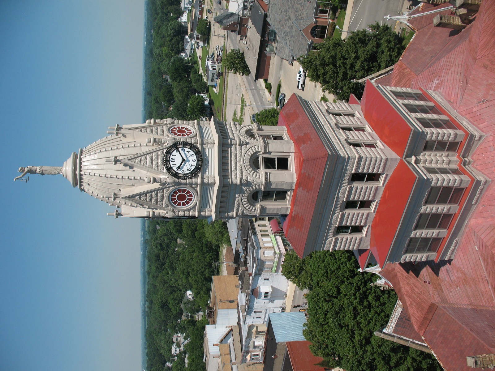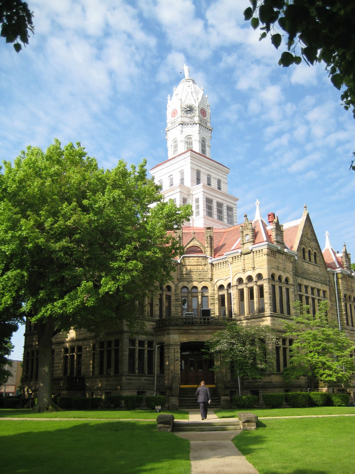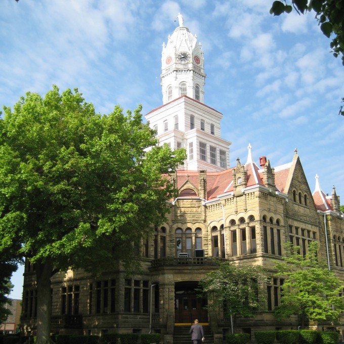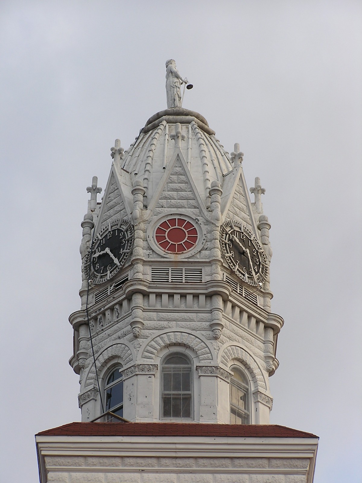 The Romanesque Revival-style Edgar County Courthouse was designed by architect Henry Eliot of Chicago and was constructed in Paris, Illinois, from 1891 to 1893. Rising 150 feet above grade from the center of the Ohio sandstone building is a galvanized steel and zinc sheet metal-clad, tiered bell and clock tower topped with a copper-clad dome. The tower and dome are capped by a zinc sheet metal statue referred to as "Lady Justice." The tower is the focal point of downtown Paris and is visible for miles around Edgar County. The building has been listed on the National Register of Historic Places since 1981.