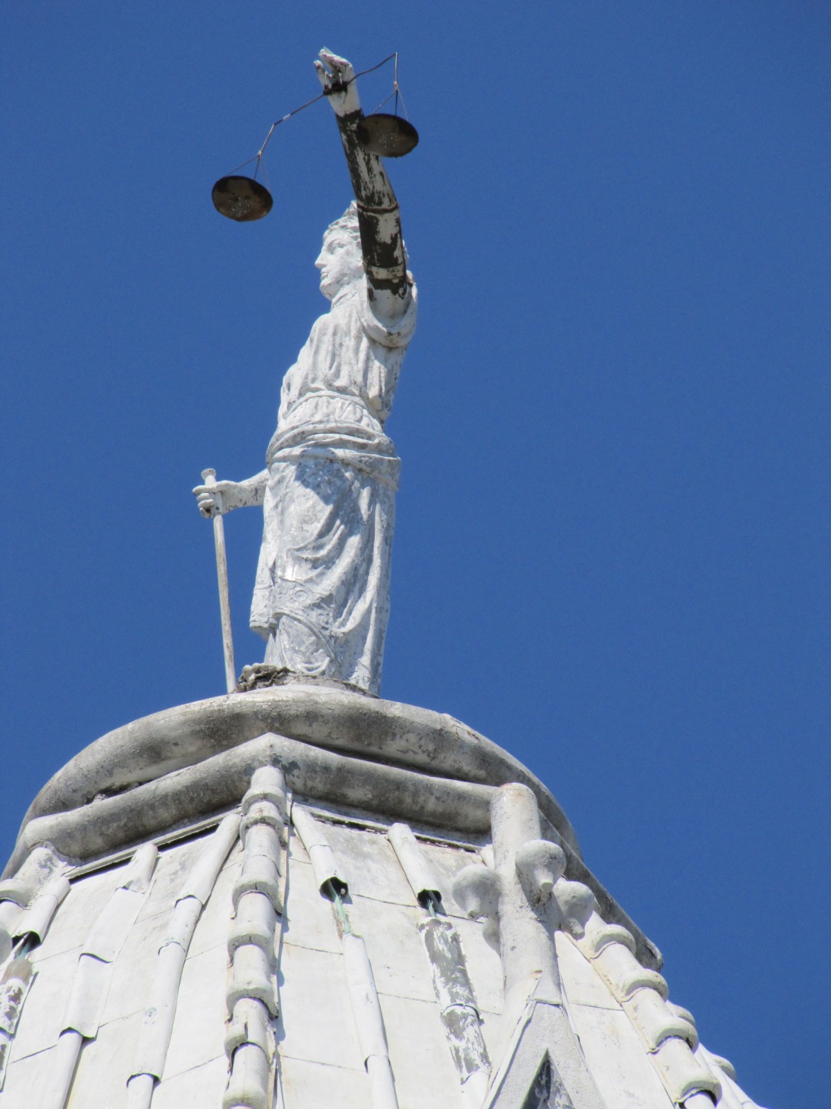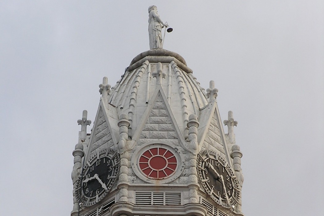 WJE's repairs to the exterior sheet metal cladding included complete removal of existing coatings, in-kind replacement of the copper roofing on the dome, in-kind replacement of significantly deteriorated sheet metal decorative cladding components, supplemental anchorage of the existing sheet metal cladding to remain, patching of deteriorated but salvageable elements with lead sheets molded to the desired shape, epoxy patching of small holes in the metal cladding, and recoating of the tower and dome with a high-performance coating system. The severely deteriorated statue support framing was replaced in-kind, and the bell room floor framing was strengthened. Lady Justice was removed from the building and shipped offsite for complete restoration that included disassembly, removal and replacement of existing coatings, and the installation of a new internal support system. Missing and severely deteriorated components of the statue were replaced.