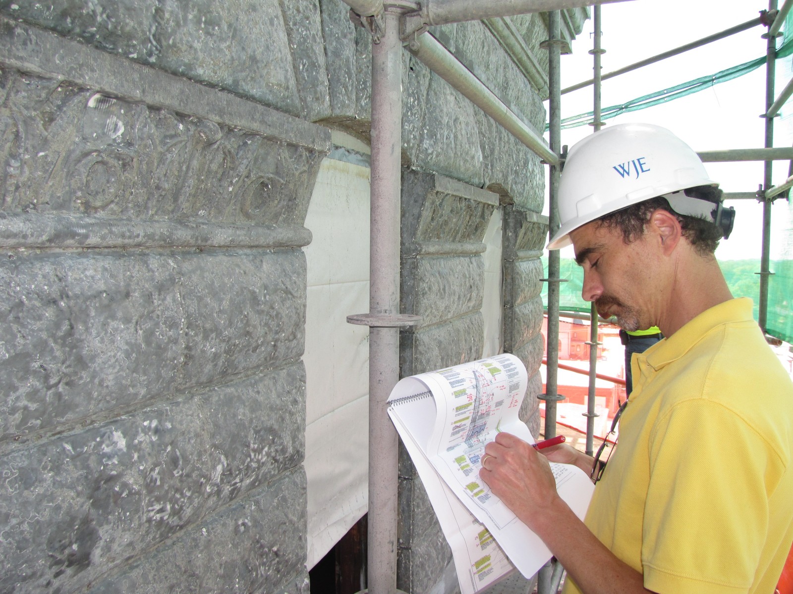 Edgar County contacted WJE in 2005 to evaluate the stability of Lady Justice, as well as the building in general, due to reports of the statue leaning. WJE's investigation determined that the timber support framing for the statue was severely deteriorated due to long-term exposure to moisture. Temporary stabilization was installed until funding for repairs could be procured. The goal of the evaluation was to develop repair documents to restore the tower, dome, and statue.