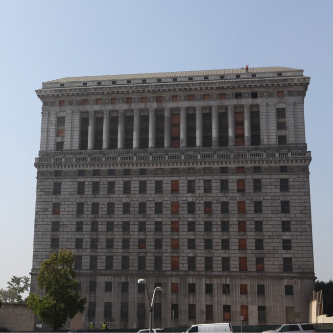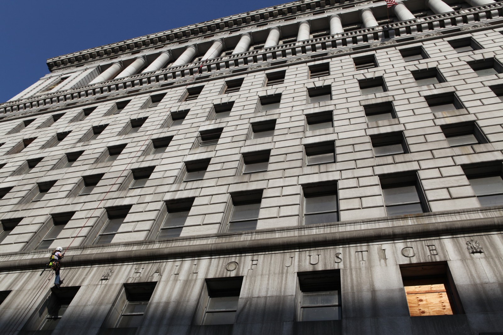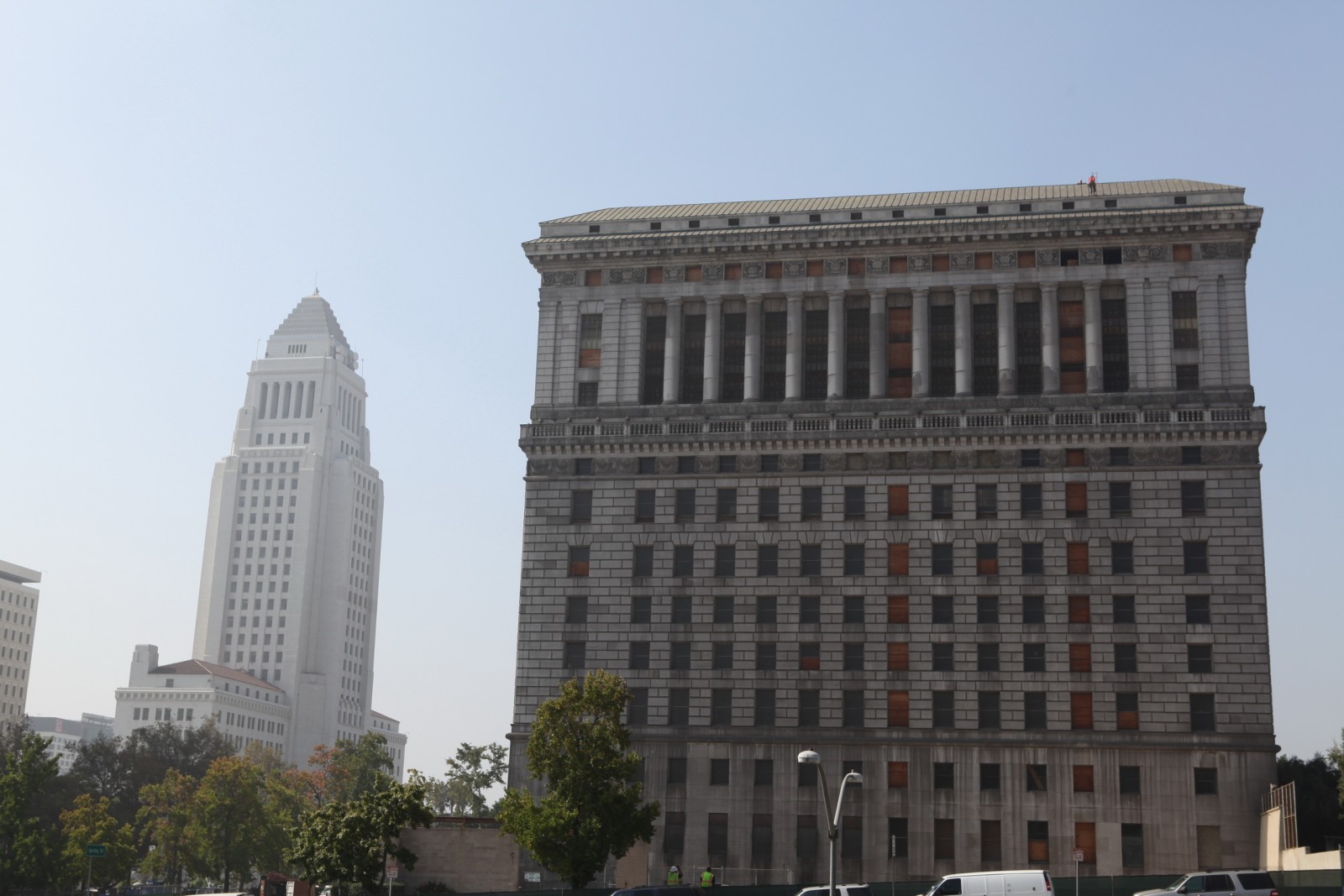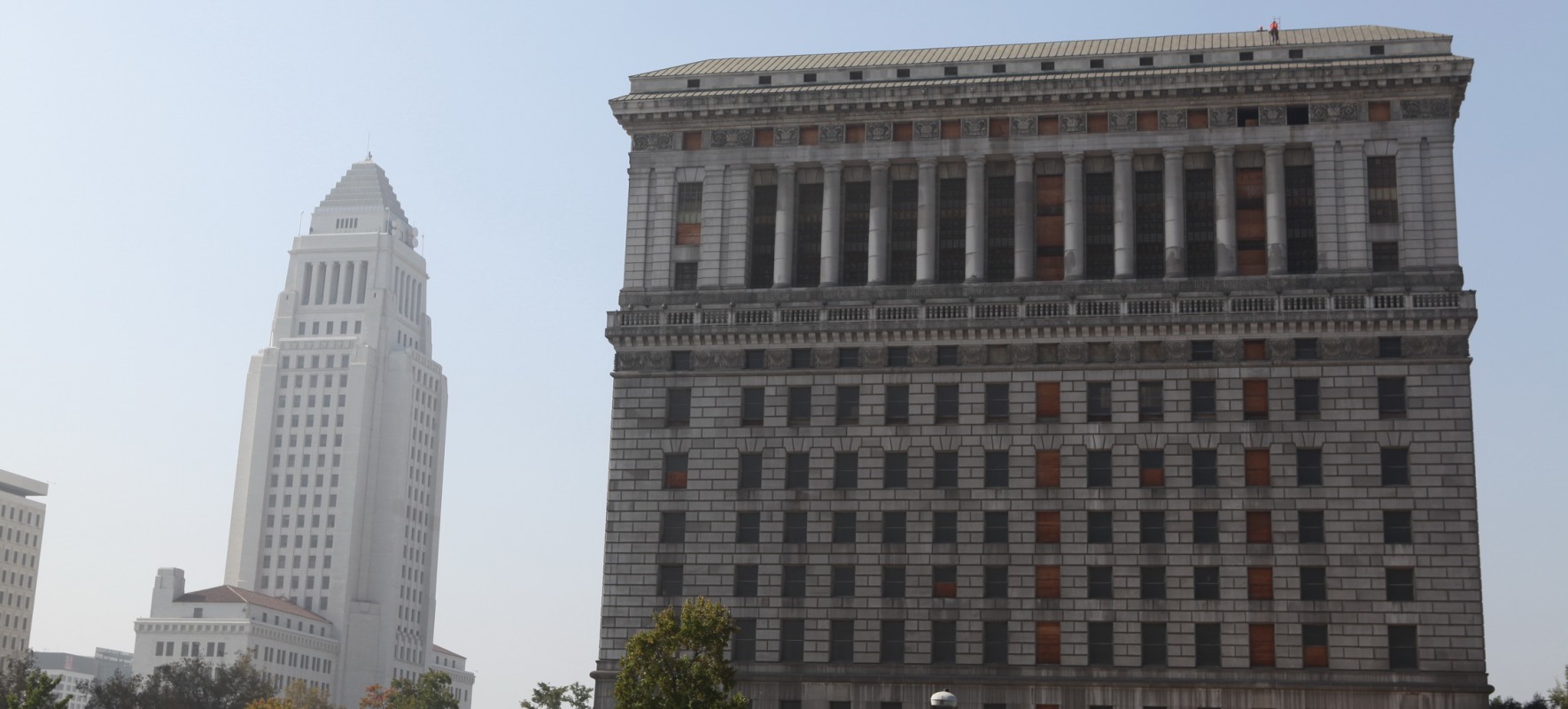 Designed in the early 1920s, the Beaux-Arts/Italian Renaissance Hall of Justice is a fourteen-story, concrete-encased steel frame building clad in granite and ornamental terra cotta. The organization of the exterior facades alludes to the three parts of a classical column—base, shaft, and capital. Each facade features a colonnade composed of eleven granite Doric columns as well as a design motif of festoons, rosettes, and cow skulls. The building also features two rectangular light courts clad with glazed brick.