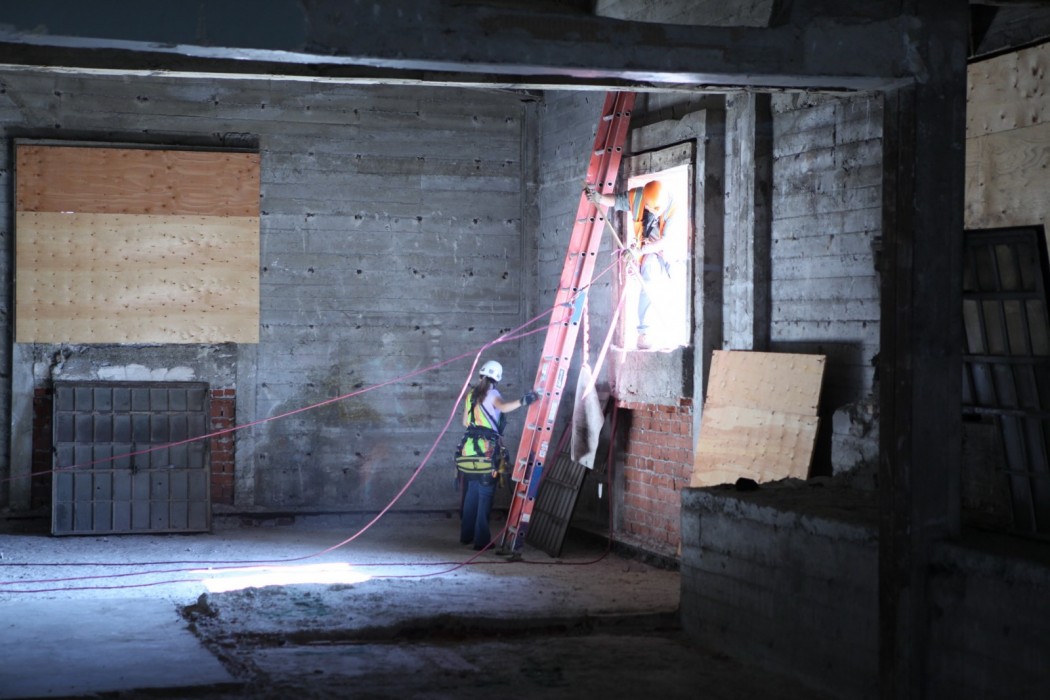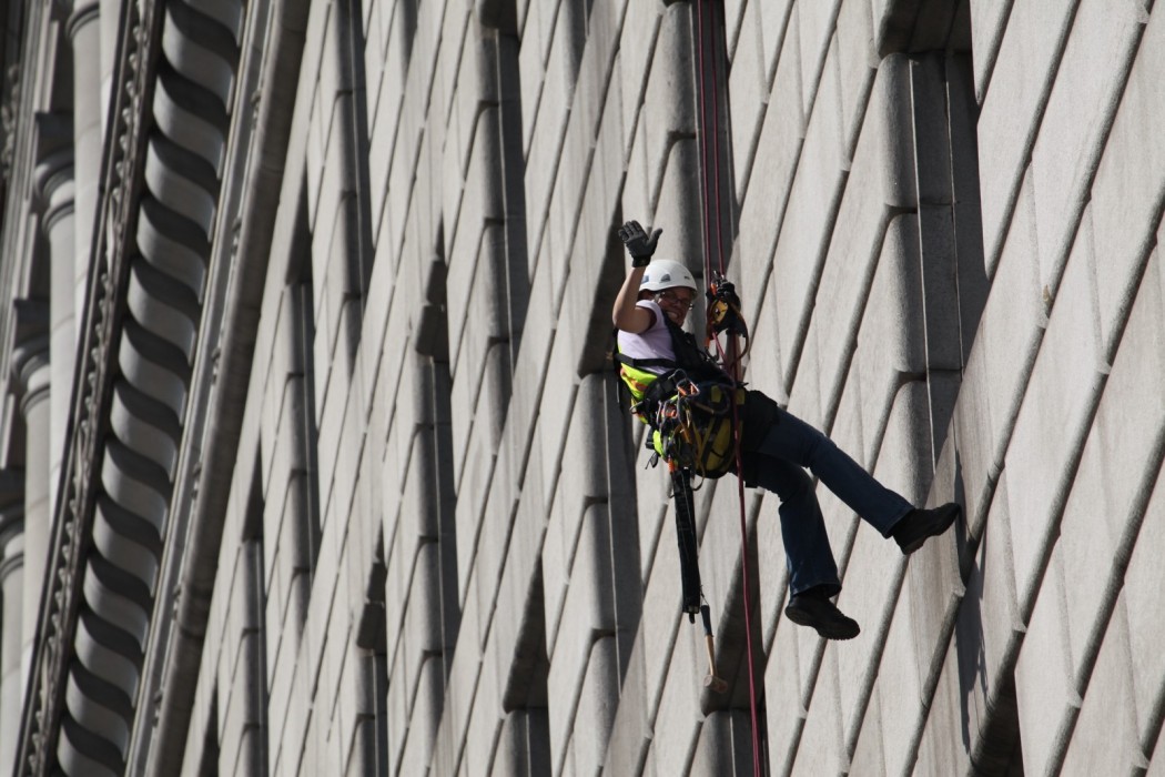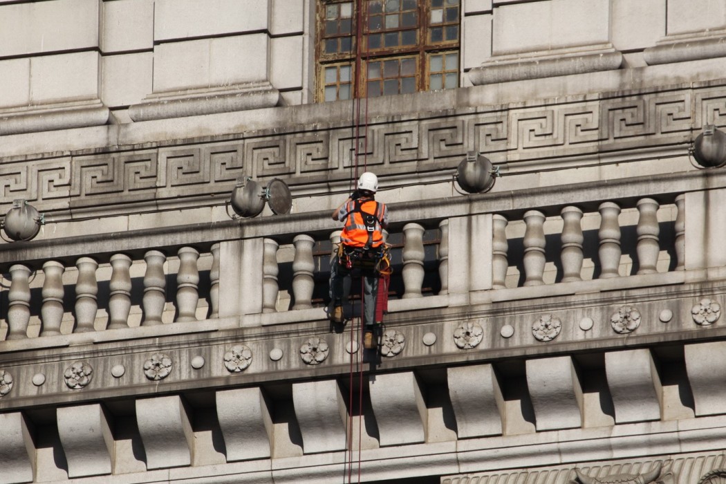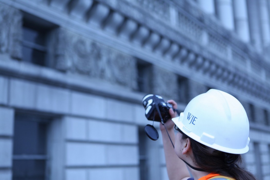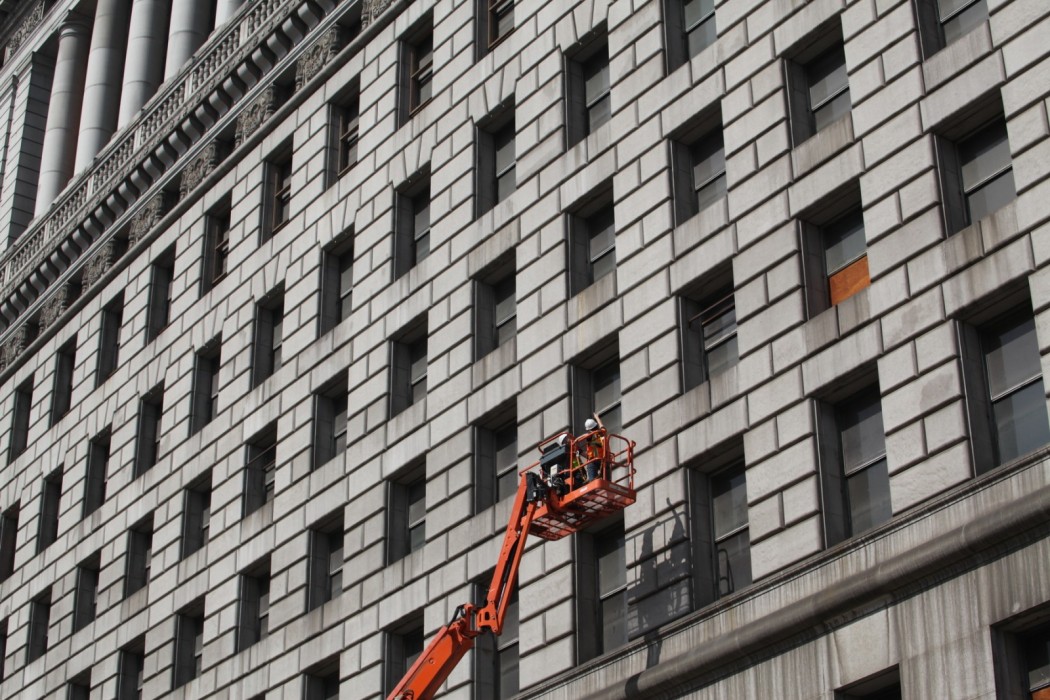 WJE completed a limited visual survey of the exterior masonry, fenestration, and copper roofing, documenting representative conditions from grade, the roof, and interior spaces. A 135-foot aerial personnel lift and industrial rope access techniques were used to perform close-up inspections of the granite and terra cotta portions of the facades, which revealed only minor weather-related deterioration. Seismic-related damage to the facade elements was isolated to weak stories at the eighth- and ninth-floor light courts: classic X-shaped shear cracking of glazed brick masonry infill walls was noted at these locations.