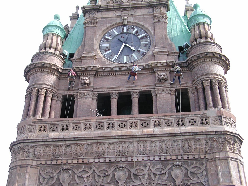 Based on the investigation, WJE developed a historically sensitive approach to the exterior restoration that was consistent with the Secretary of the Interior's Standards. A comprehensive report documented the existing conditions and the observed long-term effects of masonry cleaning and repairs performed in the 1970s. Cost estimates were also developed for repair or replacement of damaged, missing, or altered facade elements as well as for repair and supplemental reinforcement of the bell tower structure.