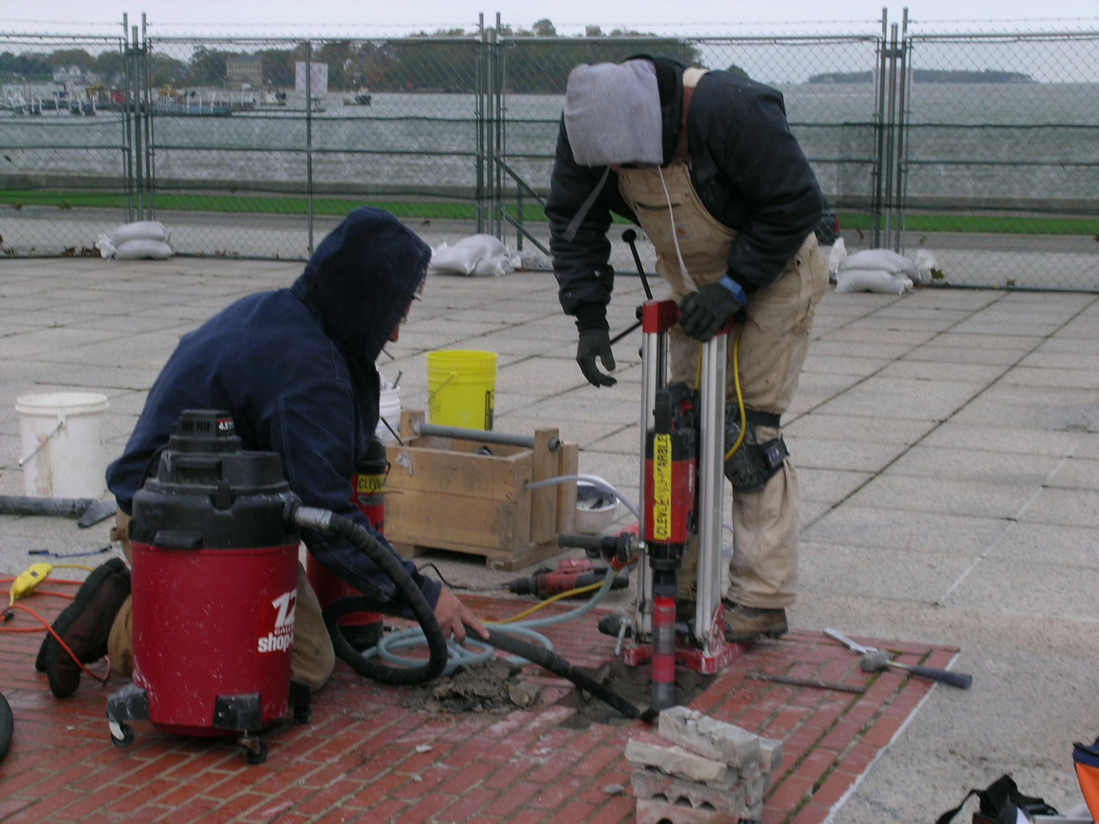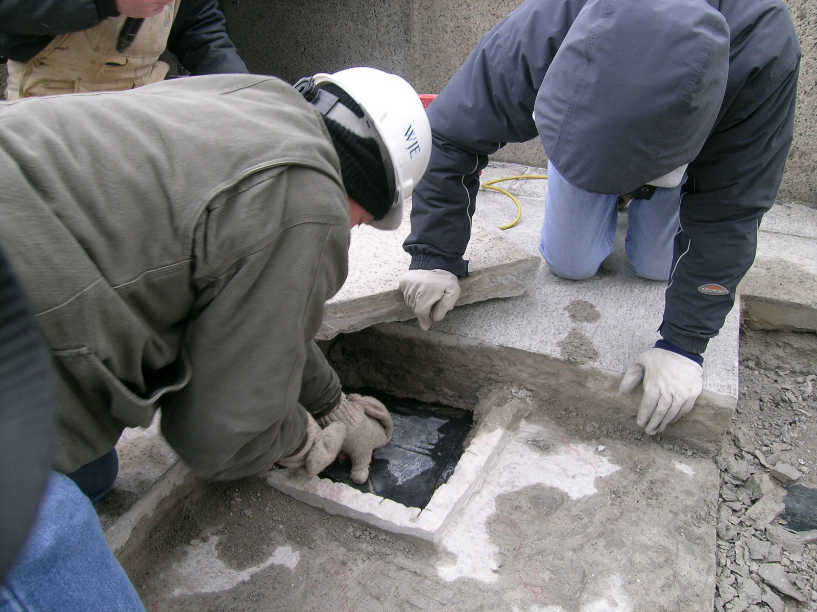 From the investigation, WJE determined that ineffective waterproofing systems allowed moisture to penetrate the concrete, resulting in freeze thaw deterioration of both the memorial and the plaza. This deterioration, coupled with through-structure anchors that had been installed as part of earlier repairs, led to cracking. Of particular concern were six fascia panels that exhibited cracking similar to the one from which a portion fell, presenting an imminent hazard.