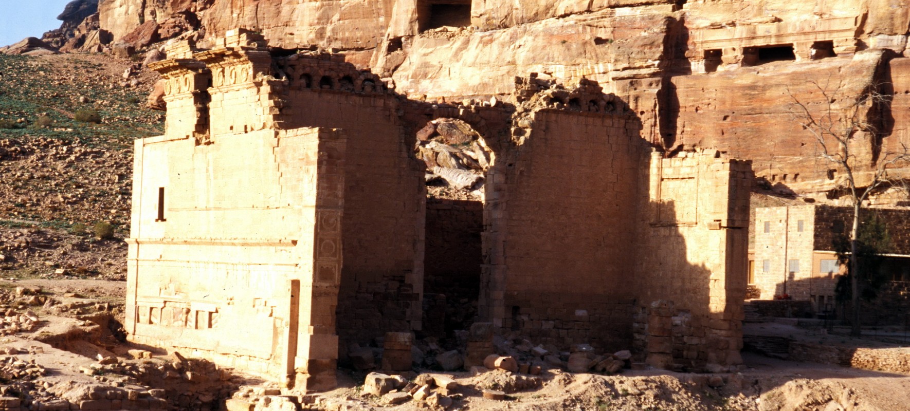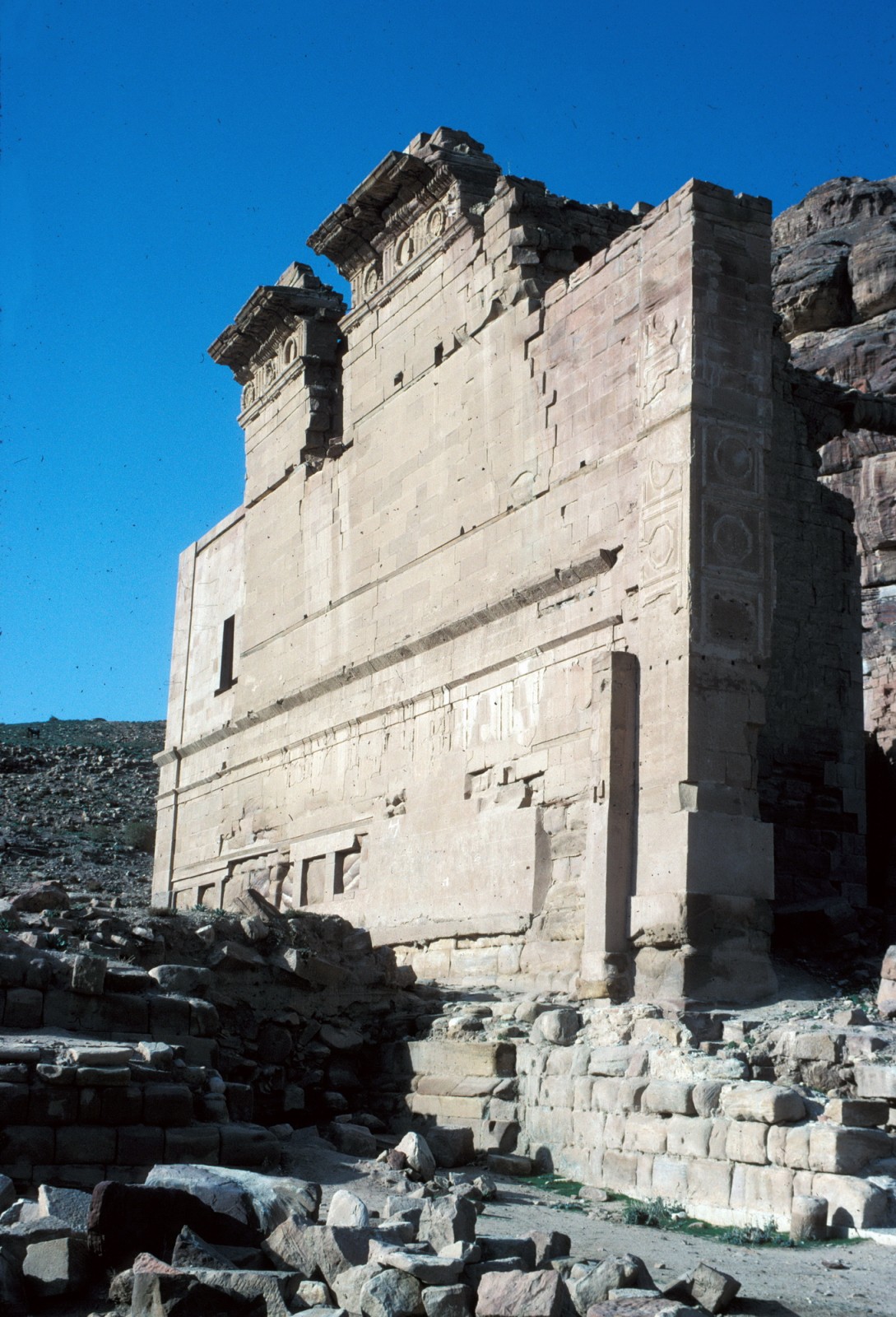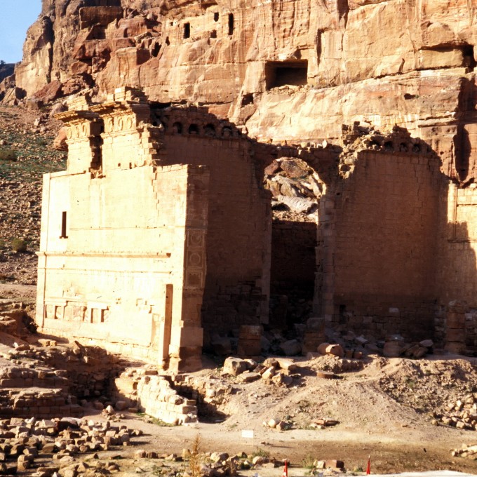 The Qasr al-Bint Monument is located in the UNESCO World Heritage site of Petra in the Hashemite Kingdom of Jordan. The monument is believed to be a Nabatean Temple that was dedicated to Dusares, the sun god, and constructed in 4 BCE. The Nabateans were pre-Islamic Semites. It is the only remaining free standing masonry structure in Petra and may be the most intact Nebatean Temple in existence. The monument was damaged by the earthquakes of 233 AD, 362 AD, and 747 AD. The City of Petra subsequently fell into obscurity and was "lost" to the western world. Petra was "rediscovered" by Sir Richard Burton during his secret trip to Mecca.
